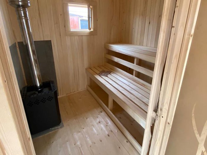 - Перегородки — доска 25 мм или вагонка на деревянном каркасе. Дверь в парилку — деревянная, без металлических элементов, открывается наружу.